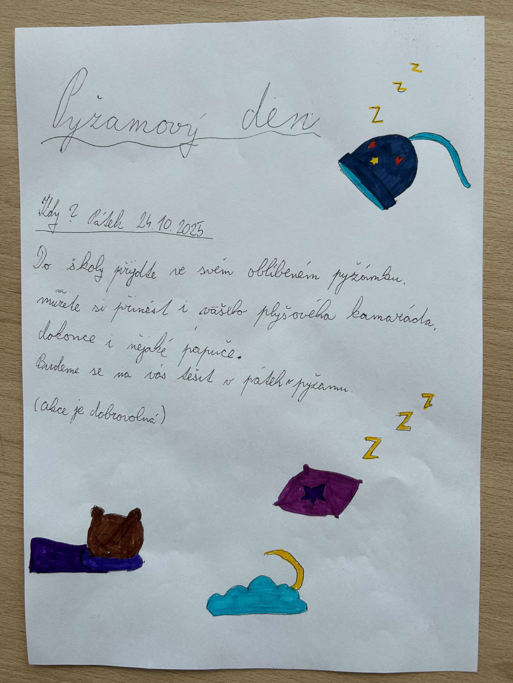 V pátek 24. října nás čeká pyžamový den! Děti si mohou přijít do školy ve svém oblíbeném pyžamu a užít si výuku v pohodlné a veselé atmosféře. Tento den si samy děti vybraly s velkým nadšením, a proto se moc těšíme na spoustu krásných pyžam a dobrou náladu po celý den.